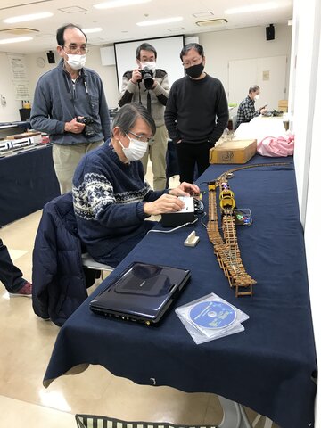 伊藤 剛氏のロータリィ・ダンパの実演があった。電源装置を新しくしたので、運転しやすい。組立式なので、滑らかな机の上では徐々に滑って位置関係が狂う。厚い布の上に敷くと摩擦が大きく、具合が良い。クラブ員は順に運転して楽しんだ。こういうモデルが60年前に存在したことは、驚異的である。