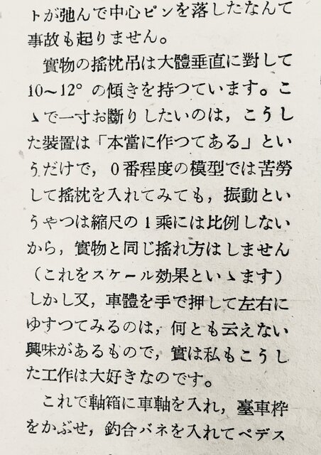 TMS誌21号(1950年)には、MCB台車の製作記事が伊藤剛氏によって書かれている。揺れ枕の話が出ているが、そこには、模型の揺れ枕は手で押すと動くのが良いが、「實物と同じ揺れ方はしません。(これをスケール効果といゝます)…」と書いてある。現代でも「揺れ枕を本物のように作った」、とご自慢の車輛を見るが、単なる自己満足の域を出ない。伊藤剛氏は揺れ枕吊りを天井まで伸ばしたものを作ってみたそうだが、それでも全然足らないと言っていた。この時代から、実物を縮小しても動作は異なると書いてあるのに、学習しない人は多く存在する。