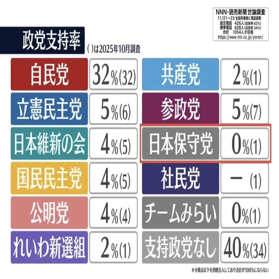 11/24に公表されたNNN・読売新聞世論調査結果では、昨年10月の衆院選で国政政党となって以降、通算3度目の支持率0%(全体では4度目)となっています。(上表の黄色部が0%)