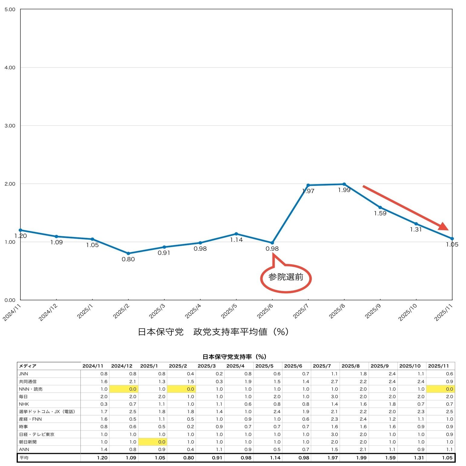 日本保守党の11月平均支持率は1.05%となり、参院選前(0.98%)とほぼ同レベルまで下落しています。