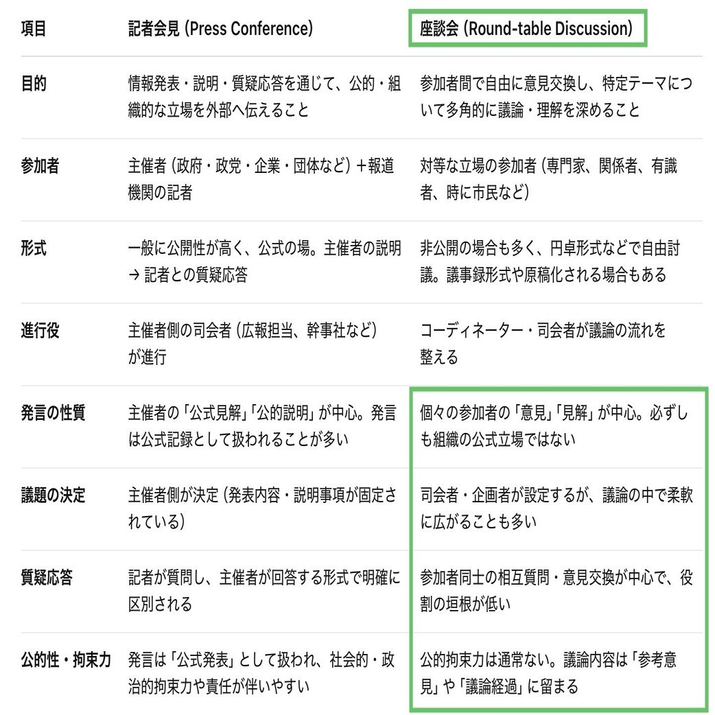 ChatGPTで記者会見と座談会の違いをまとめてみましたが、発言の性質 / 議題の決定 / 質疑応答 / 公的性・拘束力の項目を見ると、記者会見と言うより「座談会」と呼ぶのが妥当ではないでしょうか?