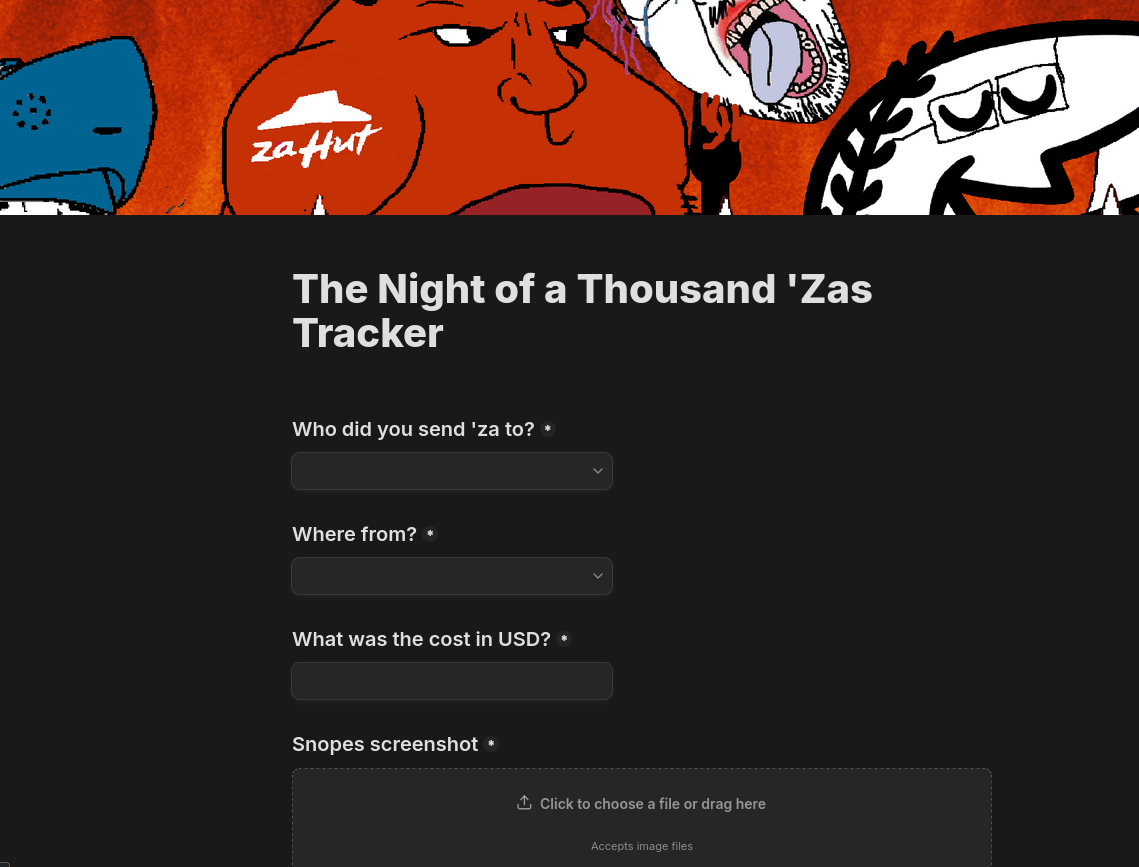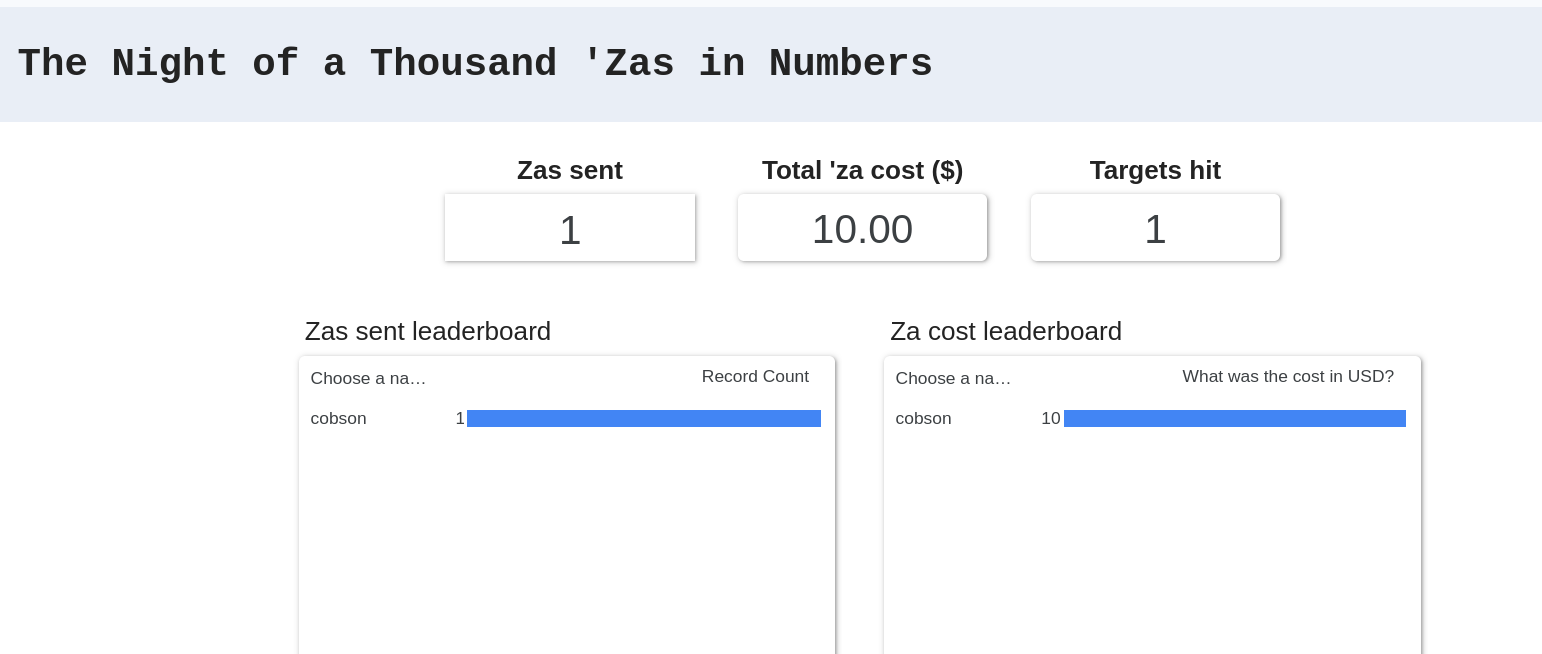 NUSOIS I CREATED A 'ZA TRACKING SYSTEM AND LEADERBOARD FOR THE NIGHT OF A THOUSAND 'ZASthis will make it easier to keep track of who has been sent 'za already and will give us some numbers for the operation. it also keeps all the 'za screenshots in one place