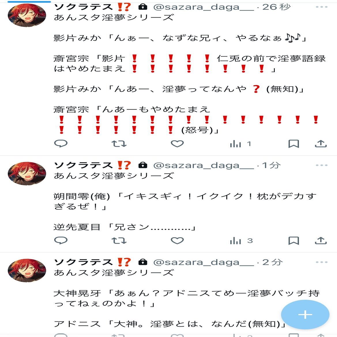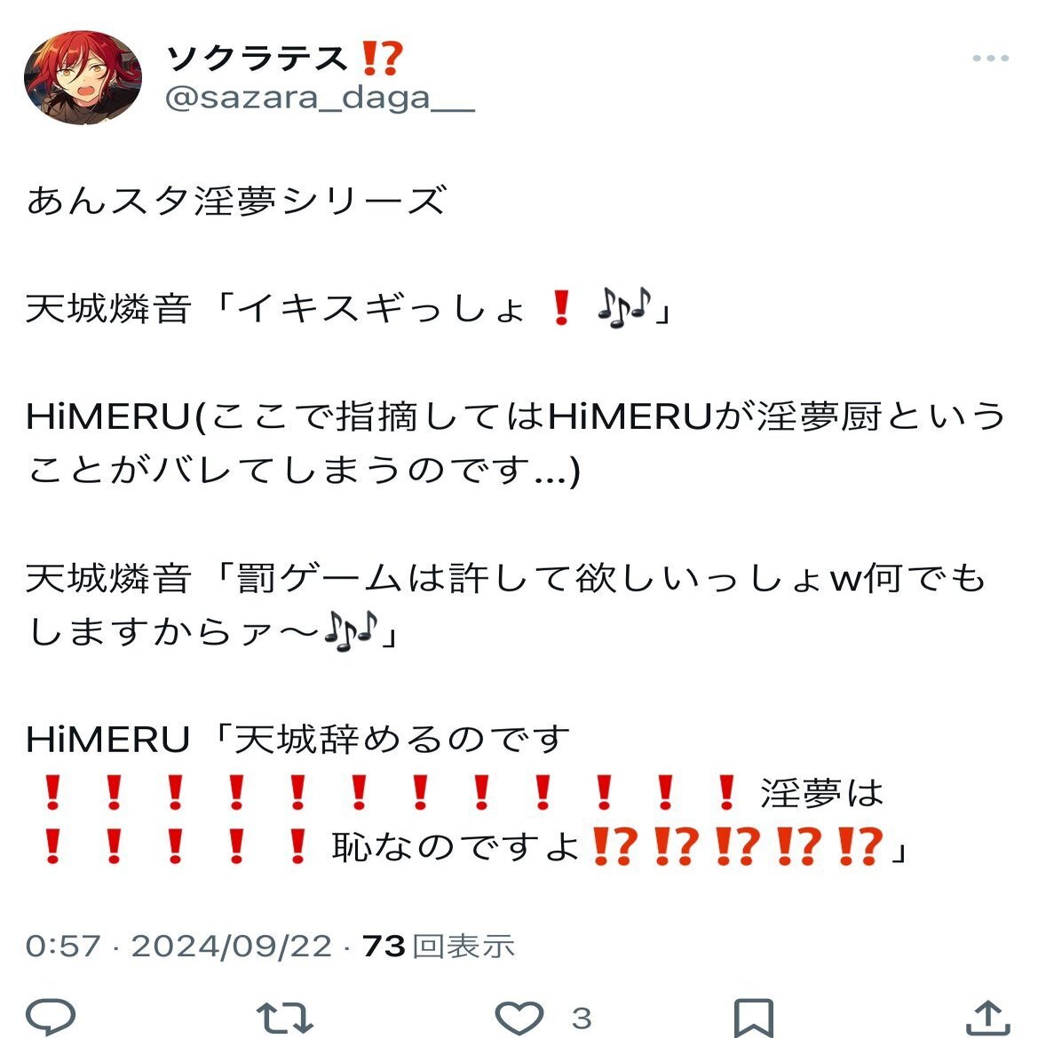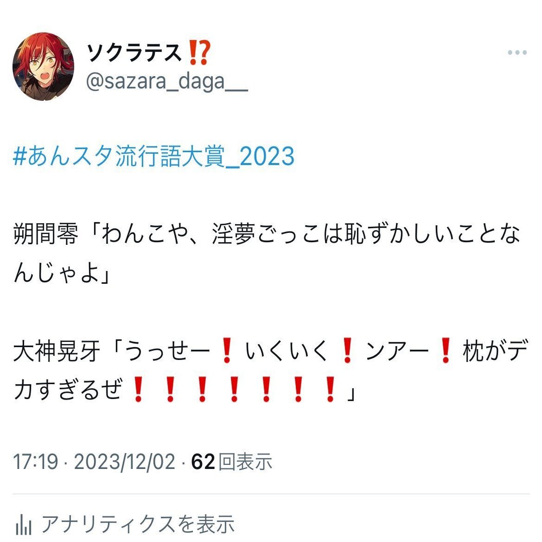 いやなんかマジでとにかく激ヤバです。私の語彙力が無いせいで伝わんないかもしれないけど❗️❗️❗️❗️直接的な語彙避けたろ笑優しかろ笑とかしてたら朱桜司になった位には語彙力ないけど❗️❗️❗️