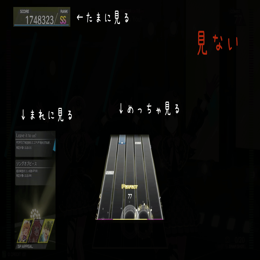特にツアマスは音ゲー全体で見ても群を抜いて複雑で、フレーム単位のスイッチ操作でSPアピールを発動させ、あえてGREATやGOODでノーツを拾うことが高得点に繋がるので、上位を目指す上でリズム感というものは二の次になっている。