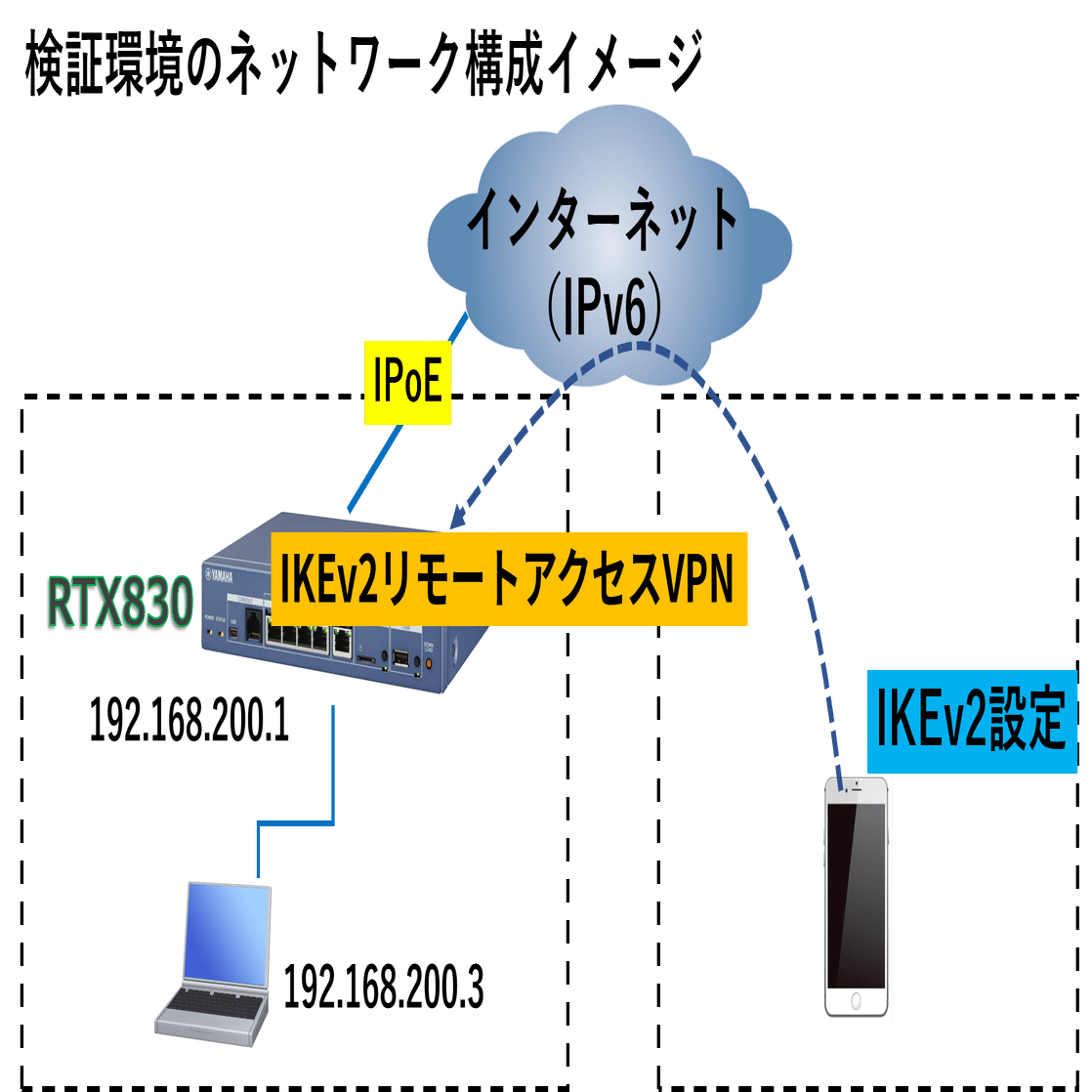 下図は、今回の検証環境のネットワークイメージです。左側のRTX830がIPoEでインターネットに接続されていて、ここにIKEv2リモートアクセスVPNの設定をします。