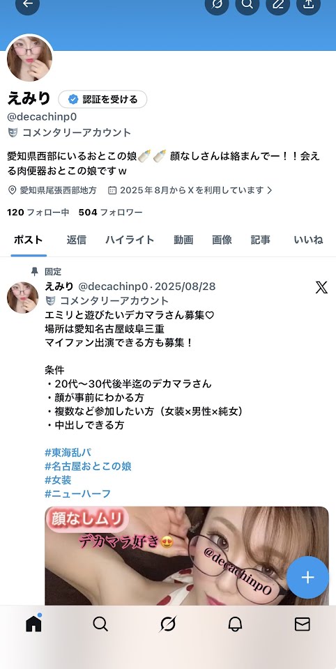 尾張西部から!乳ありペニクリありのおとこの娘です!デカオチンポが大好きなど変態です!