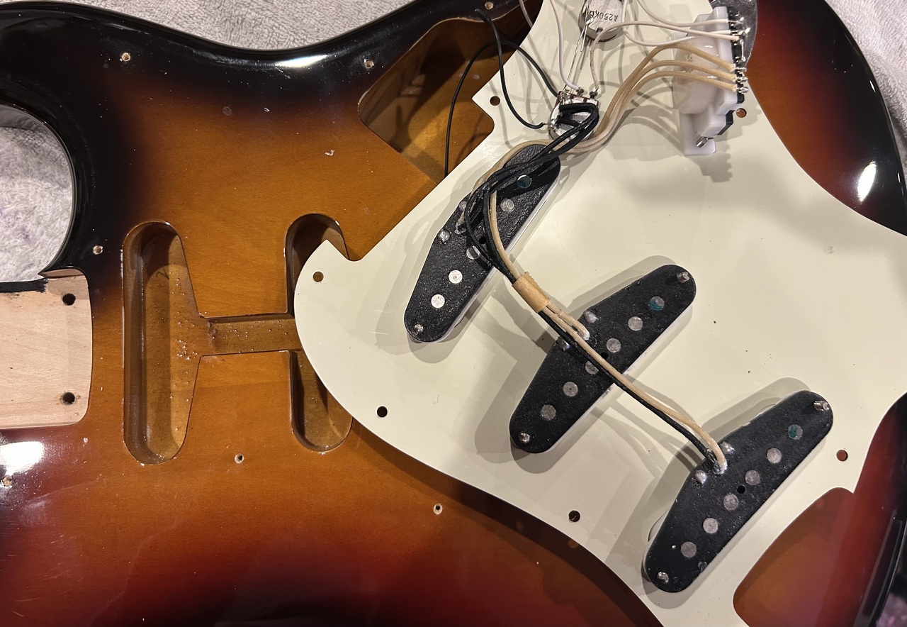 正式な型番はわかりかねますが、おそらくバスウッドボディにUSAピックアップ仕様のST62-58あたりではないかと推測されます。なおパーツ変更などあるかもしれませんが断定はできませんのでご容赦ください。