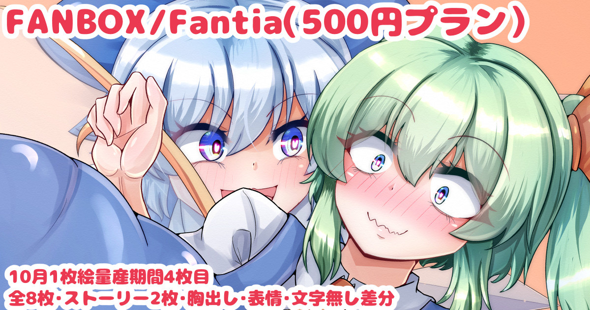 今月の1枚絵量産期間の4枚目です。大チルです。前後で2人描いてたのでちょっと時間かかっちゃいました。超乳に合わせてちょっと乳首大き目です。差分は表情の組み合わせを変えたものも。1.ストーリー(2枚)2.表情・文字無し差分(6枚)もしよろしければページ下部のいいねを押したりコメント貰えると嬉しいです!