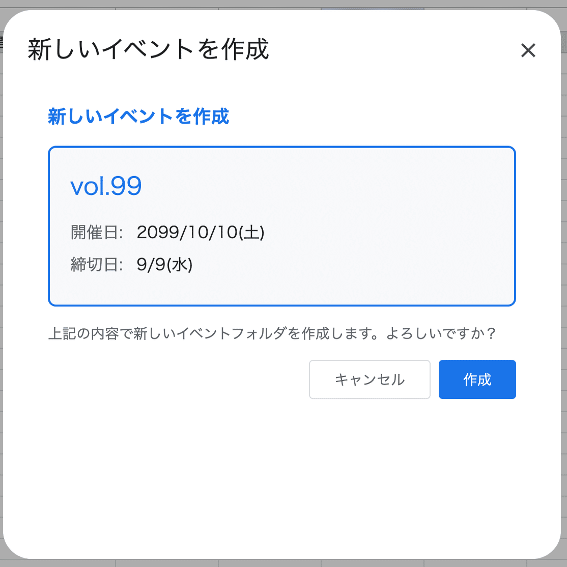 こんな感じのモーダルが表示されます。作成を押すと、テンプレート用のフォルダにあるファイルの名前や内容を書き換えてコピーしてくれます。