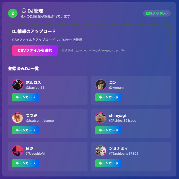 DJ情報をCSV形式でアップロード(Google Formと紐づけたスプレッドシートをそのままアップするだけ)