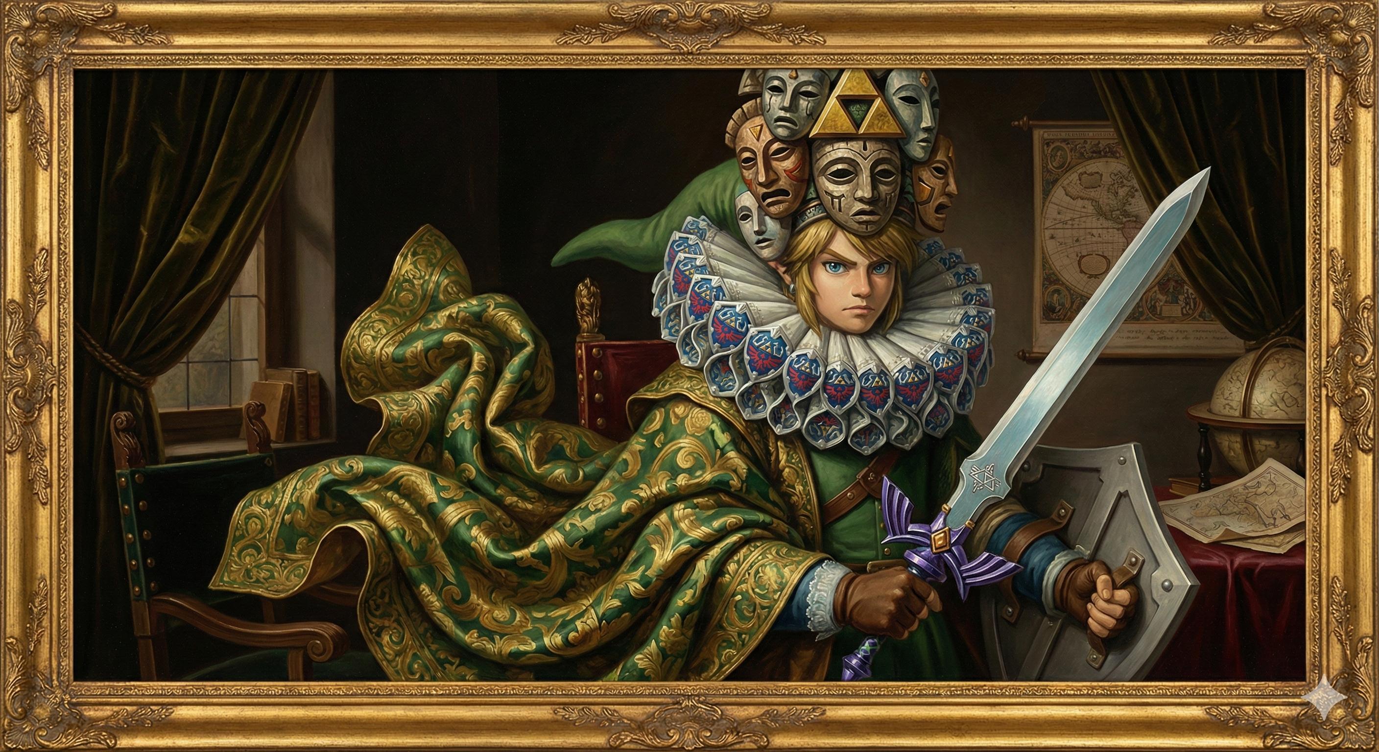 {Link (The Legend of Zelda)} illustrated in the satirical Baroque portraiture style of Volker Hermes: {