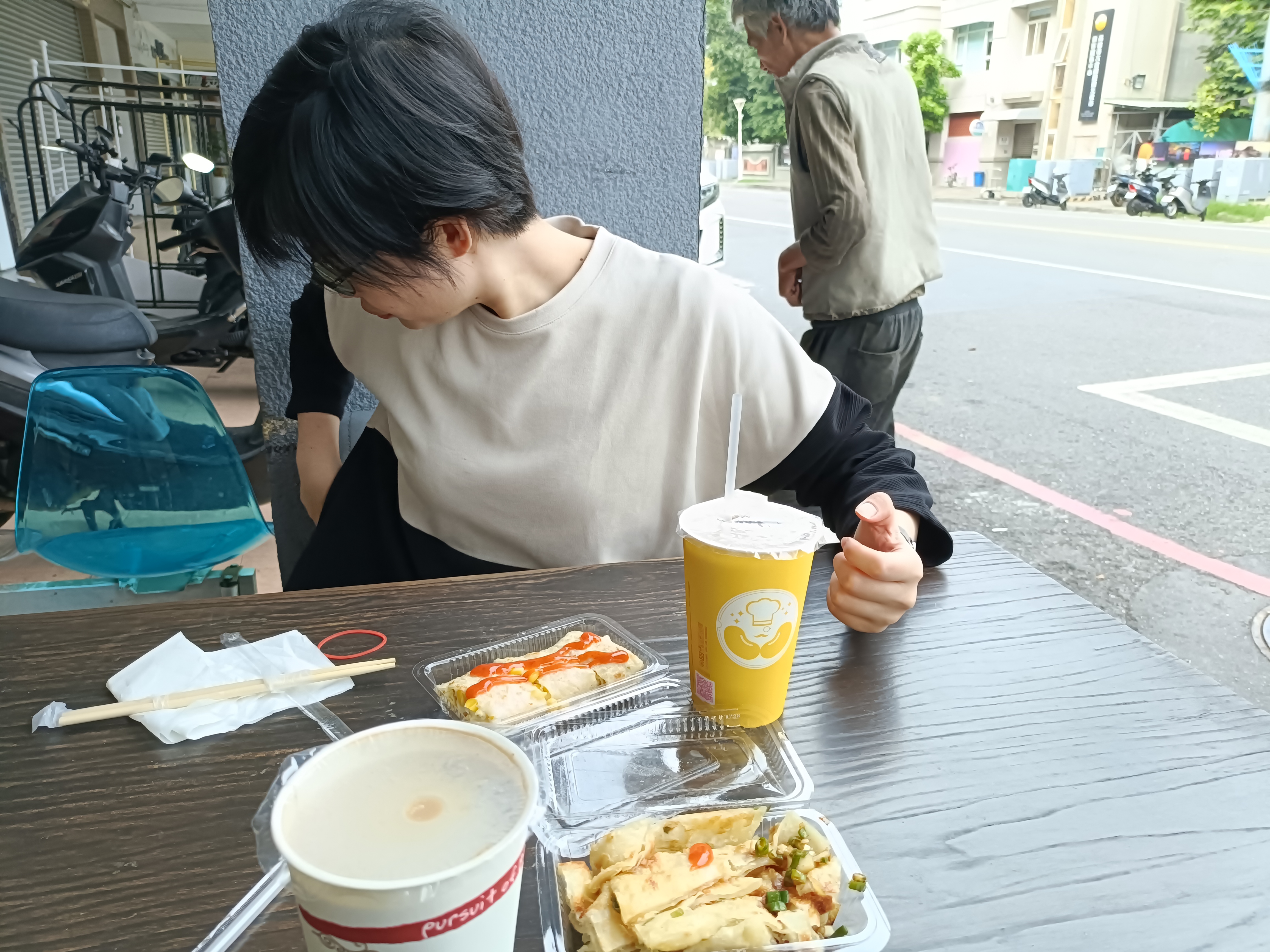 私は米漿(ミーチャン お米のジュース)と玉米蛋餅(ユーミータンピン とうもろこしのお好み焼き)を注文。四谷くんは咖啡牛奶(カーフェイニョウナイ コーヒー牛乳)と葱油餅(ツォンヨウピン)。