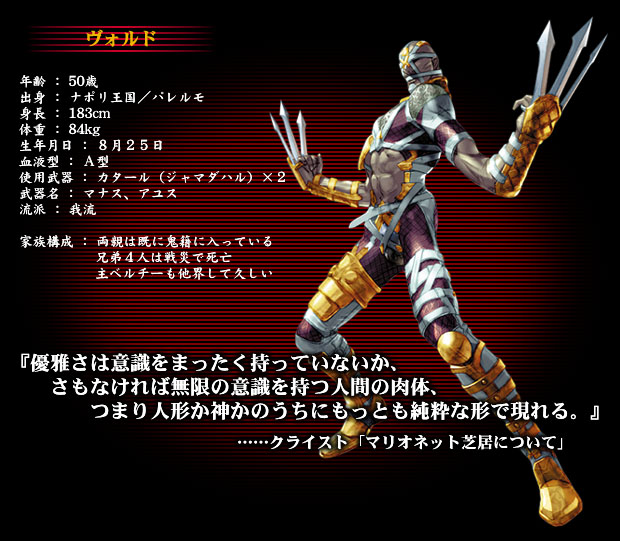 16.ヴォルド(ソウルキャリバー) ゲームでキャラを選ぶときは、かわいい女の子かイロモノを選ぶ傾向があります。 最終的には可愛い好きより変なの好きが勝りがちw 呼吸音だけでセリフ一切なしで、動きが変態的だけど、主人に忠義を尽くす執事なので、ところどころ上品さも垣間見えて素晴らしい。