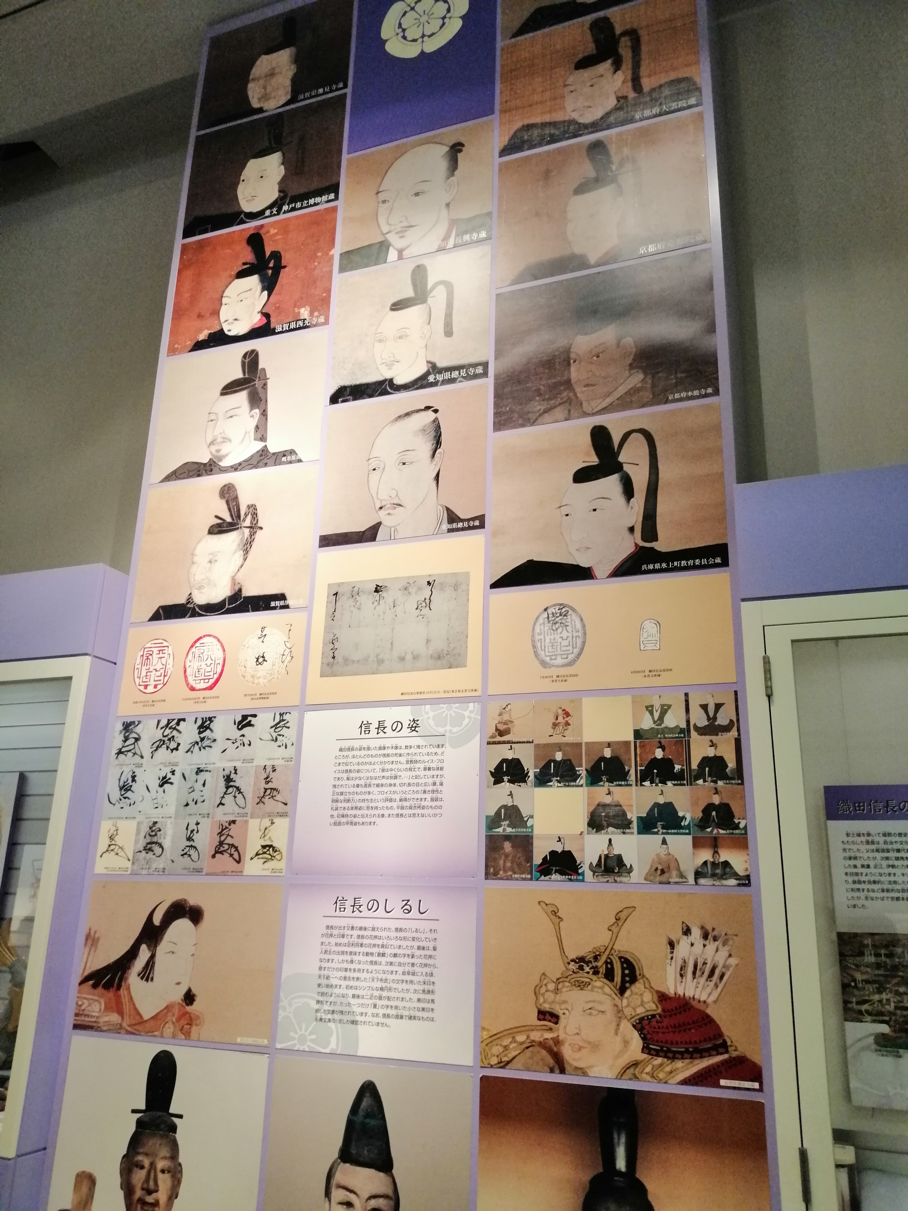 1枚目:飛び出し坊やが信長、表情がナイス 2枚目:安土駅前には信長像 3枚目:博物館では信長肖像画いっぱい 4枚目:博物館にも飛び出し坊やがいたけど、こっちはちょっと若い