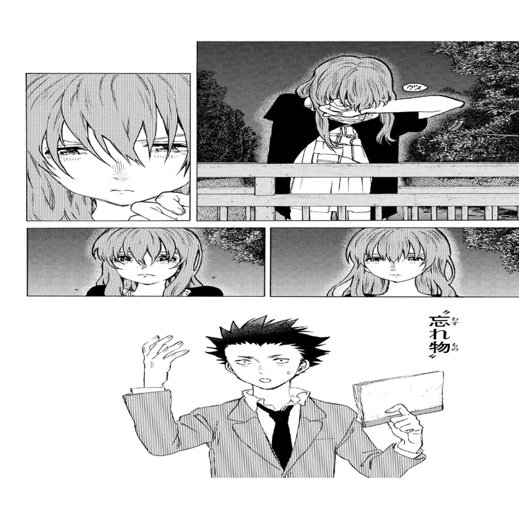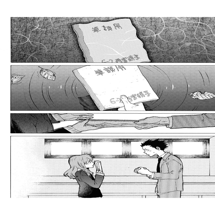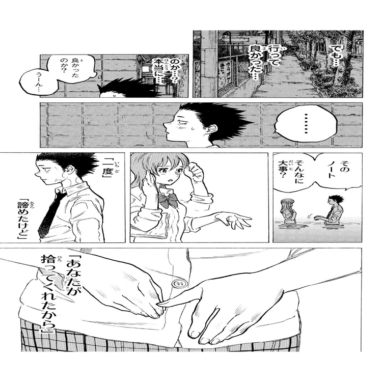かつて筆談ノートを池に投げ捨てられた硝子は、びしょ濡れになりながらそれを拾い上げた。しかし彼女は、誰かと関係を結ぼうとすることに疲れ、これ以上他者と向き合い言葉を交わすことを諦め、再びノートを池に捨てた。彼女が結弦に「死にたい」と打ち明けたのは、この後のことである。