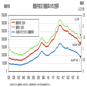 こども家庭庁のデータを見るからに我が国の未成年の子どもがいる離婚件数はH15年頃にピークを迎え、以後ゆるやかに減少傾向である。この減少傾向は婚姻数や出生数の減少に伴うものと考えられる。