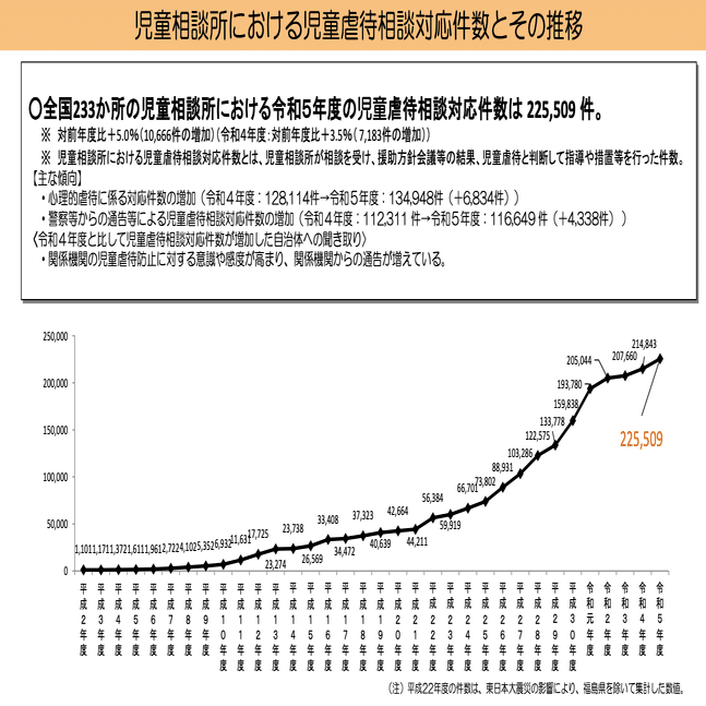児童虐待の相談件数は年々増加しており、令和5年には22万件と過去最大件数となっている(1)。(もちろんこれに関しては、昔より親が凶暴になったわけではなく、昔は児童虐待と思われていなかったことが通報されるようになってきたという側面が大きいのだと思われます。)