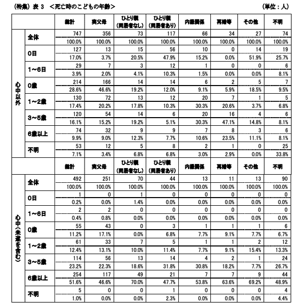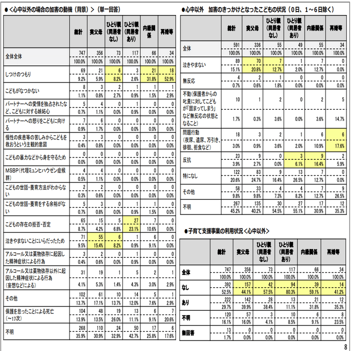 これらのことからよく言われる「母親が追い詰められて仕方なく虐待してしまう」とかいった神話が嘘であることがわかる。もちろん睡眠不足によるうつ状態などはありえるが、それにしても「仕方なく」とかではなく「虐待はやりたいからやっている」としか言いようがない。そしてやはりひとり親家庭でのリスクは高く、ひとり親(同居あるなし)、内縁、再婚を足すと292人となり、全体の747人のうち約4割を占めている。ひとり親家庭は全体の1割くらいと考えるとやはり虐待リスクが3倍以上というのはある程度信憑性のある話と理解できる。