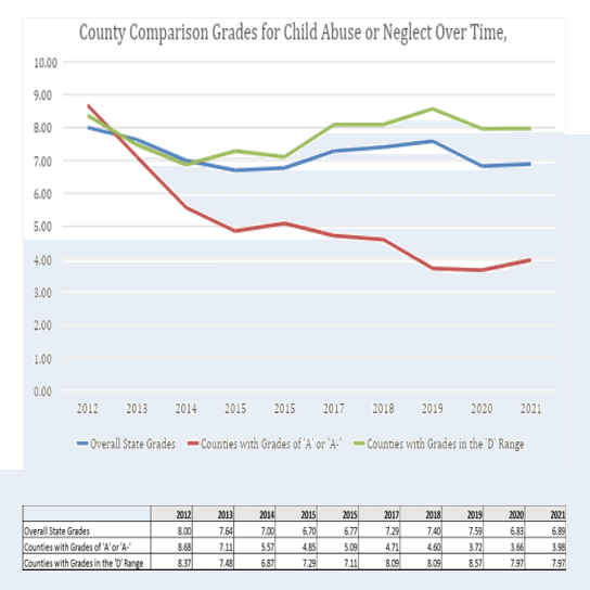 さらに興味深いことに、オハイオ州の中でも郡ごとに各地域の裁判所に「標準養育時間」規定を定めることが義務付けられており、最も平等な養育時間を定めているものをAランク、最も時代遅れの養育時間(基本片方の親の家に住み、各週末のみ1晩別居親のもとで過ごすといったもの)の群をDランクとしてランク分けした際にAランクとDランクでは虐待発生率にかなりの差があったのである。