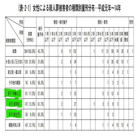 その流れか、「子供は母親の付属物である」という昔ながらの考えからなのかわからないが、つい20~30年前までは母親による子殺しはなんと執行猶予率が6〜8割という脅威の数字となっている。(よくよくみると夫などパートナーを殺しても3割執行猶予がつくのも恐ろしい話ですが…)