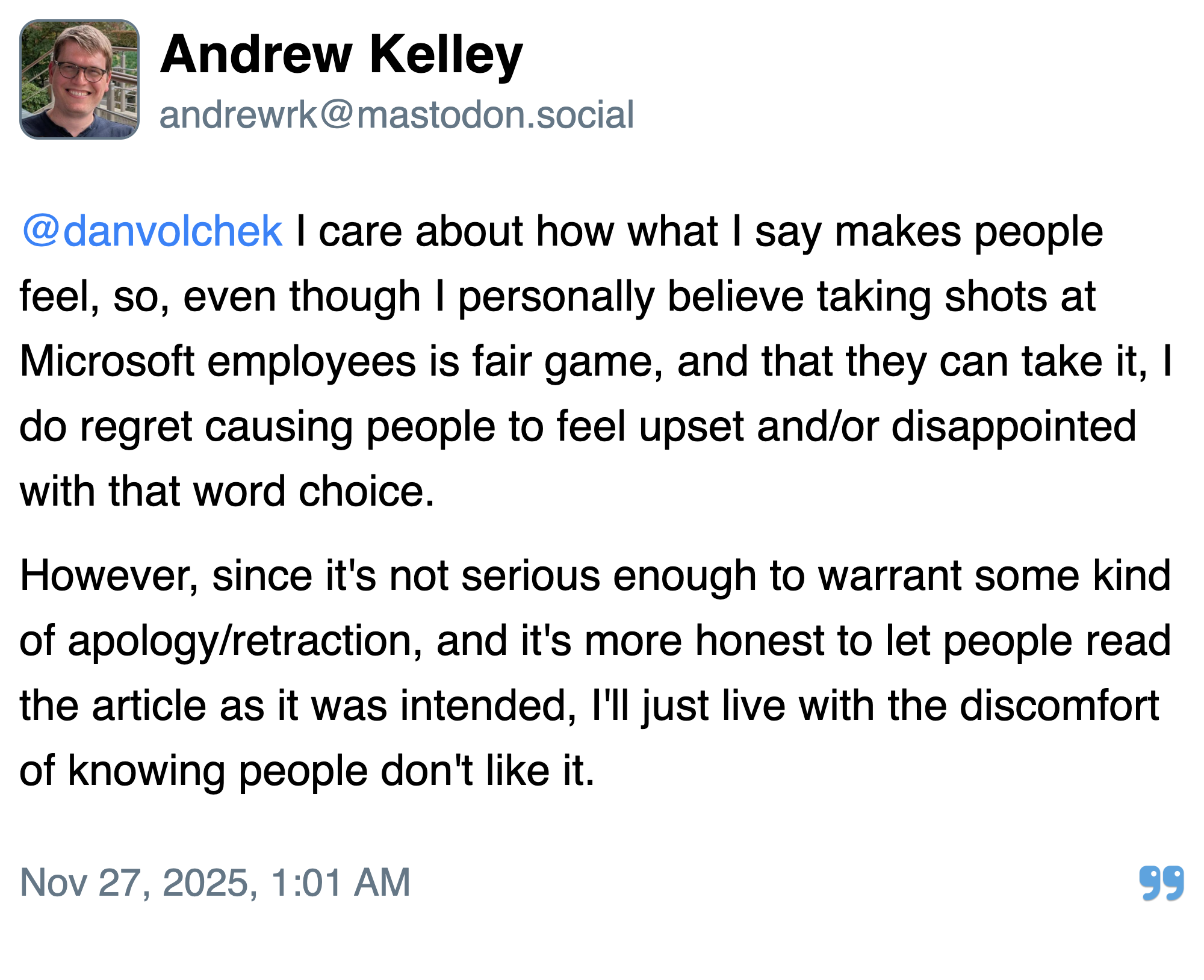 @danvolchek I care about how what I say makes people feel, so, even though I personally believe taking shots at Microsoft employees is fair game, and that they can take it, I do regret causing people to feel upset and/or disappointed with that word choice.