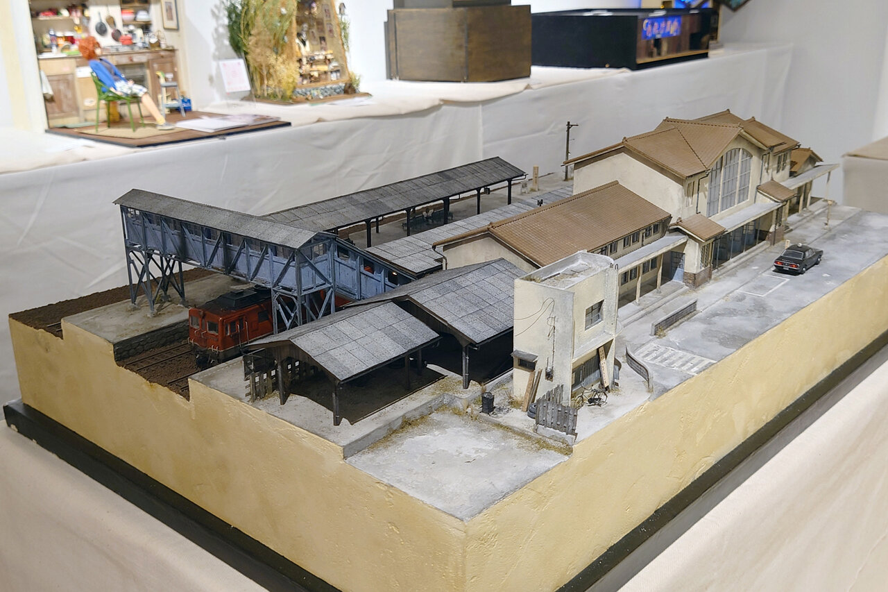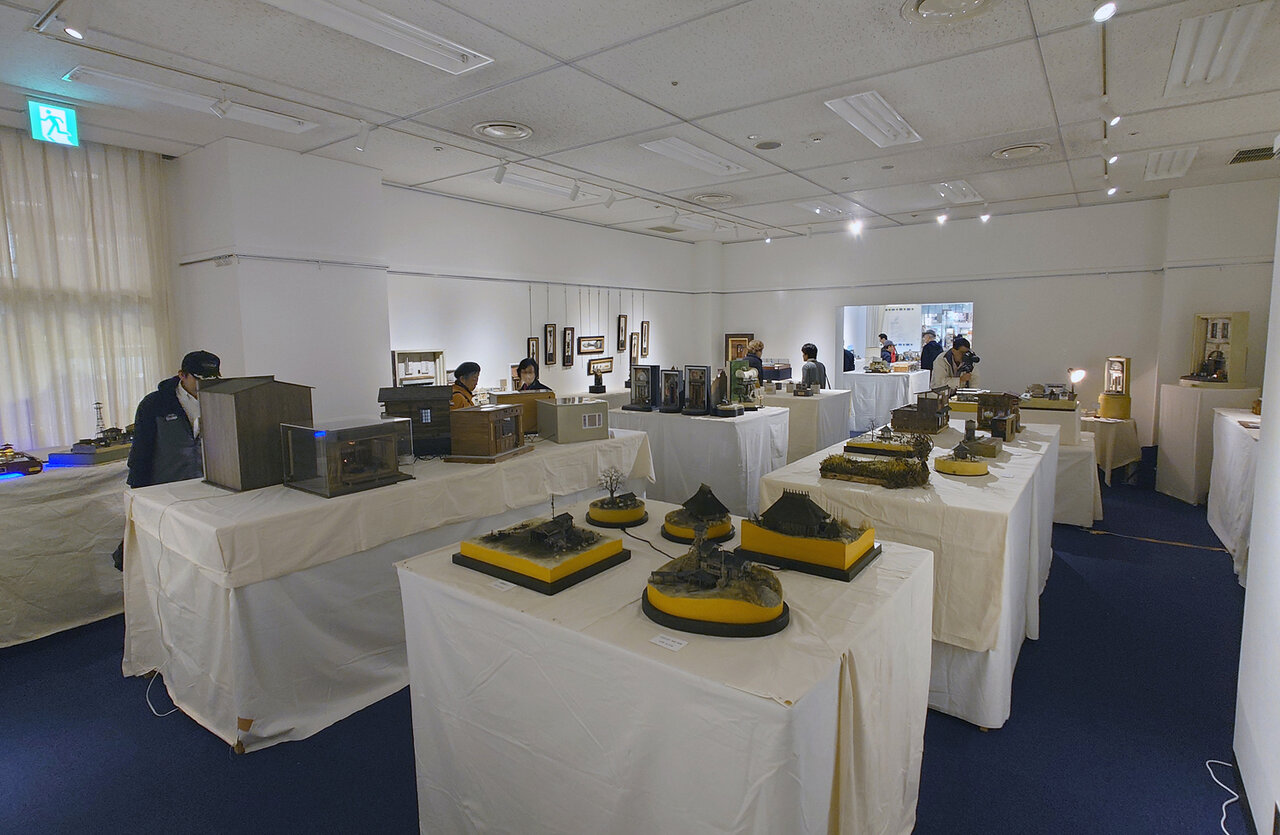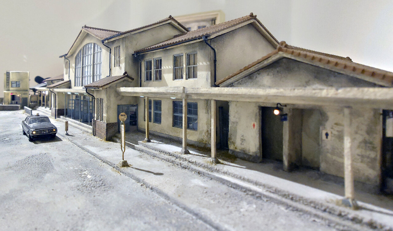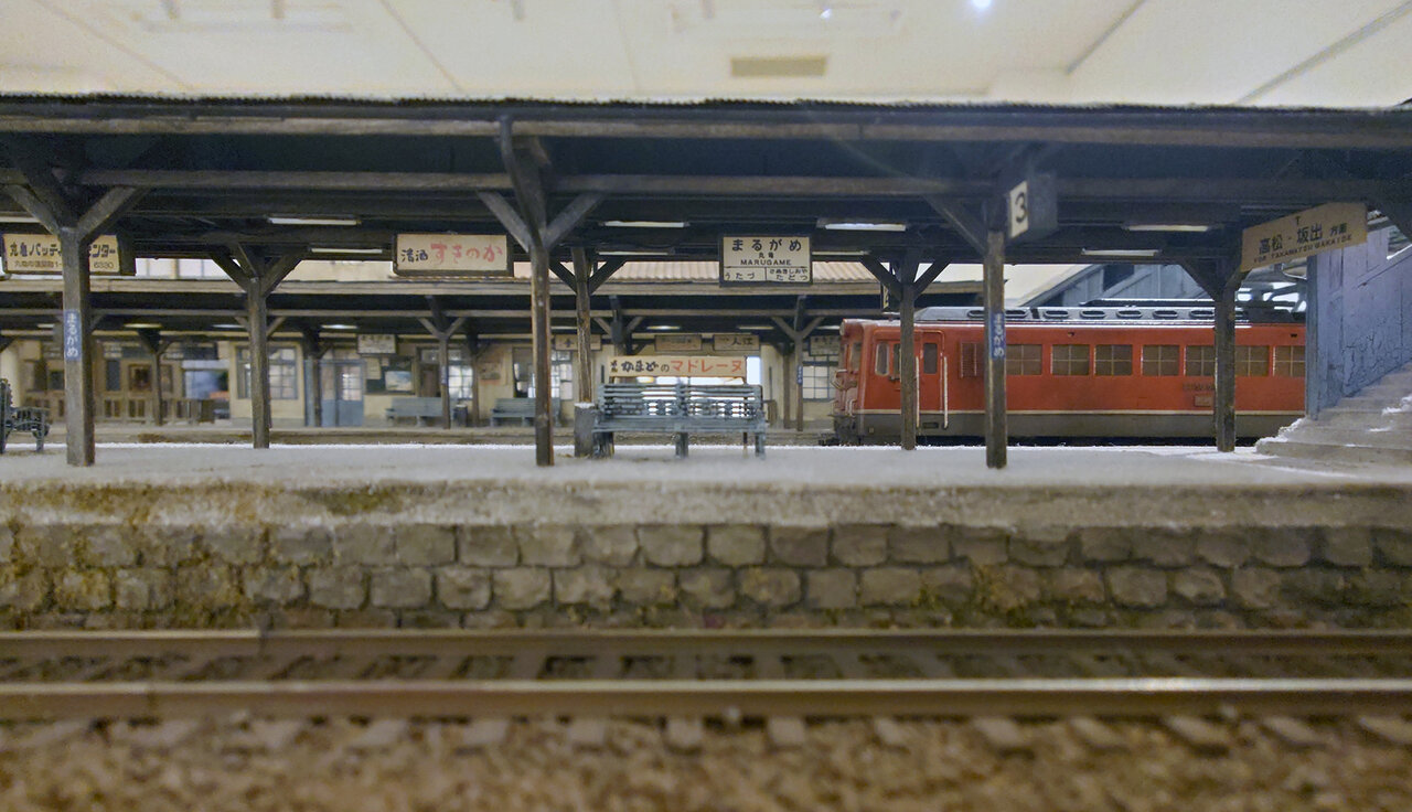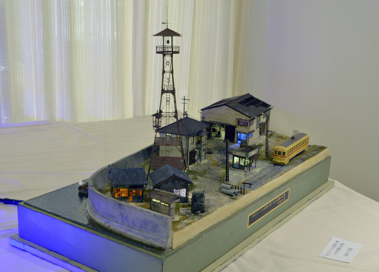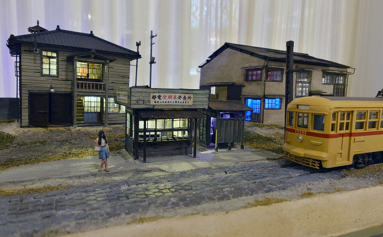 まずは正面ゲート.焦点距離16mm.f/7.1まで絞り込んでしまったが,この写真の目的であるひずみやゆがみの観察にはあまり関係ないだろうか.画面下部の横長の垂れ幕や手摺などの“直線振り”をご覧いただけるだろう.横方向のひずみを見るための,もうひとつのサンプル(?)が,真横から撮影した“HYBARI”の模型.ほぼ一直線が保たれている……ように“感じる”けれど,どうだろう.