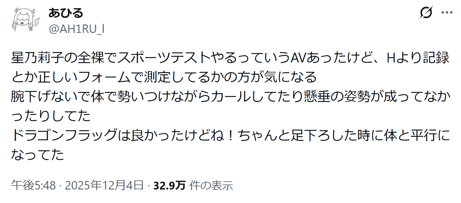 星乃莉子の全裸でスポーツテストやるっていうAVあったけど、Hより記録とか正しいフォームで測定してるかの方が気になる