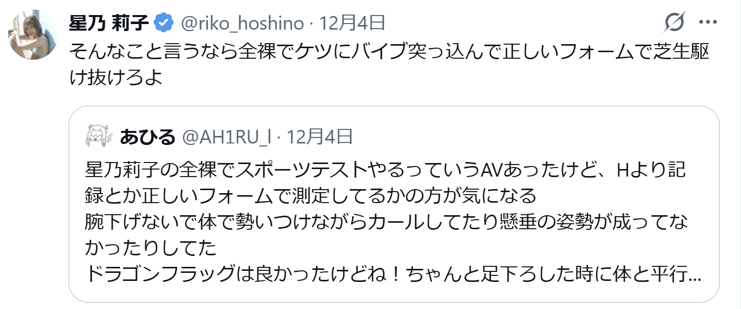 続きを読む 投稿 ID 15768AV女優の星乃莉子が全裸スポーツテストのフォームで文句いわれキレる