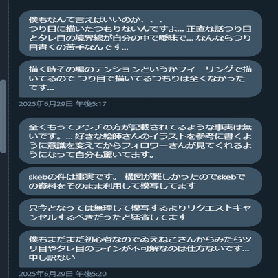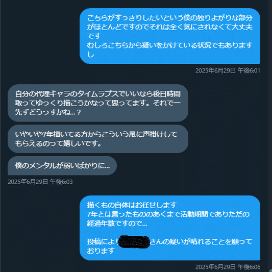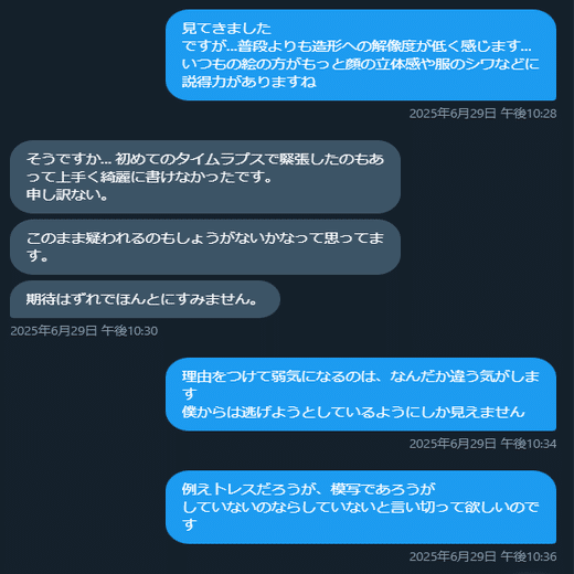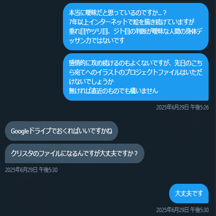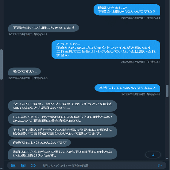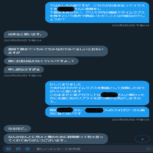 I氏のイラストに「AIトレスしてます」という文言を画像付きで送り続けていた
