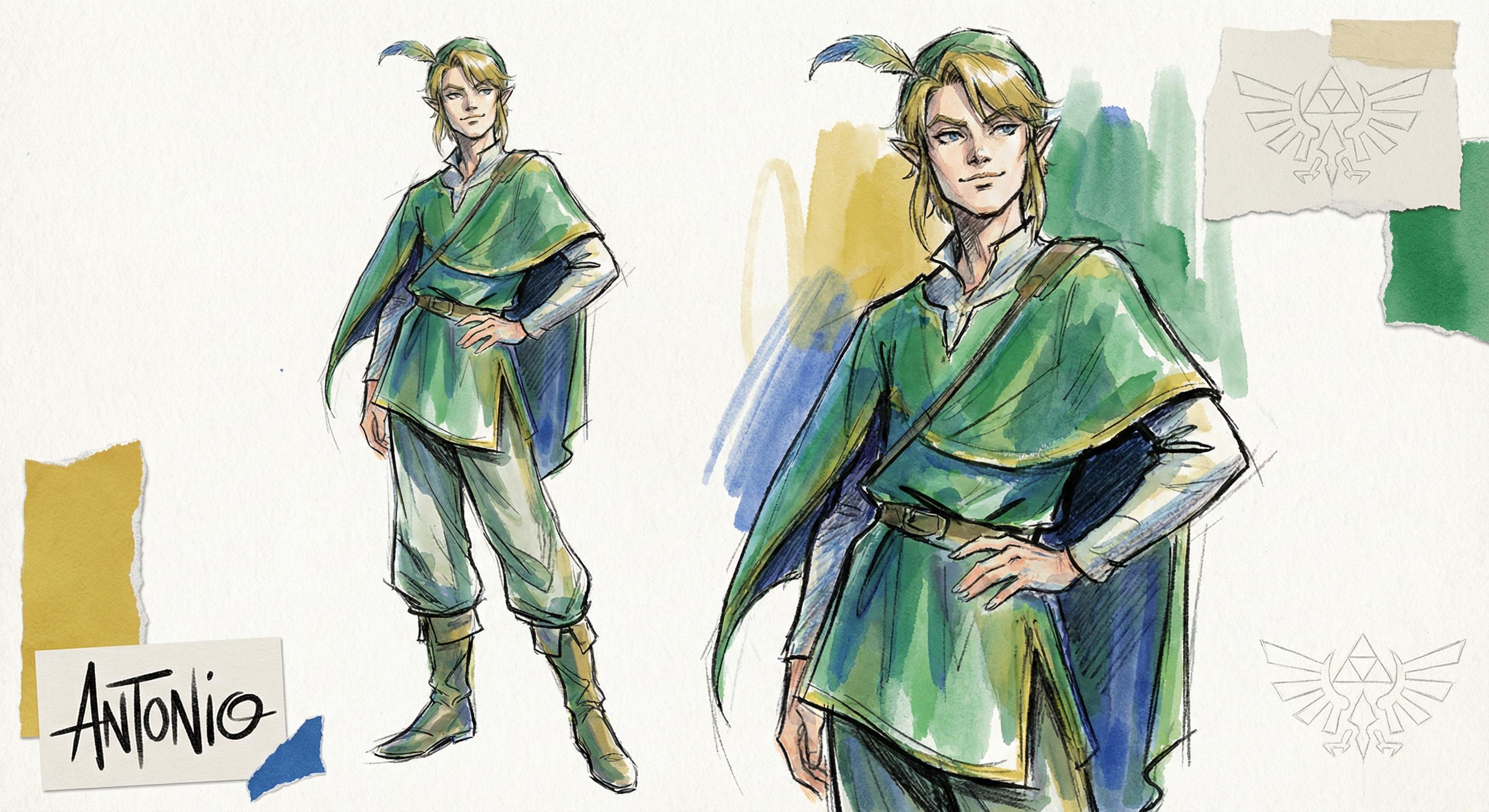 {Link (The Legend of Zelda)} illustrated in the fashion sketch style of Antonio Lopez (1943–1987): {