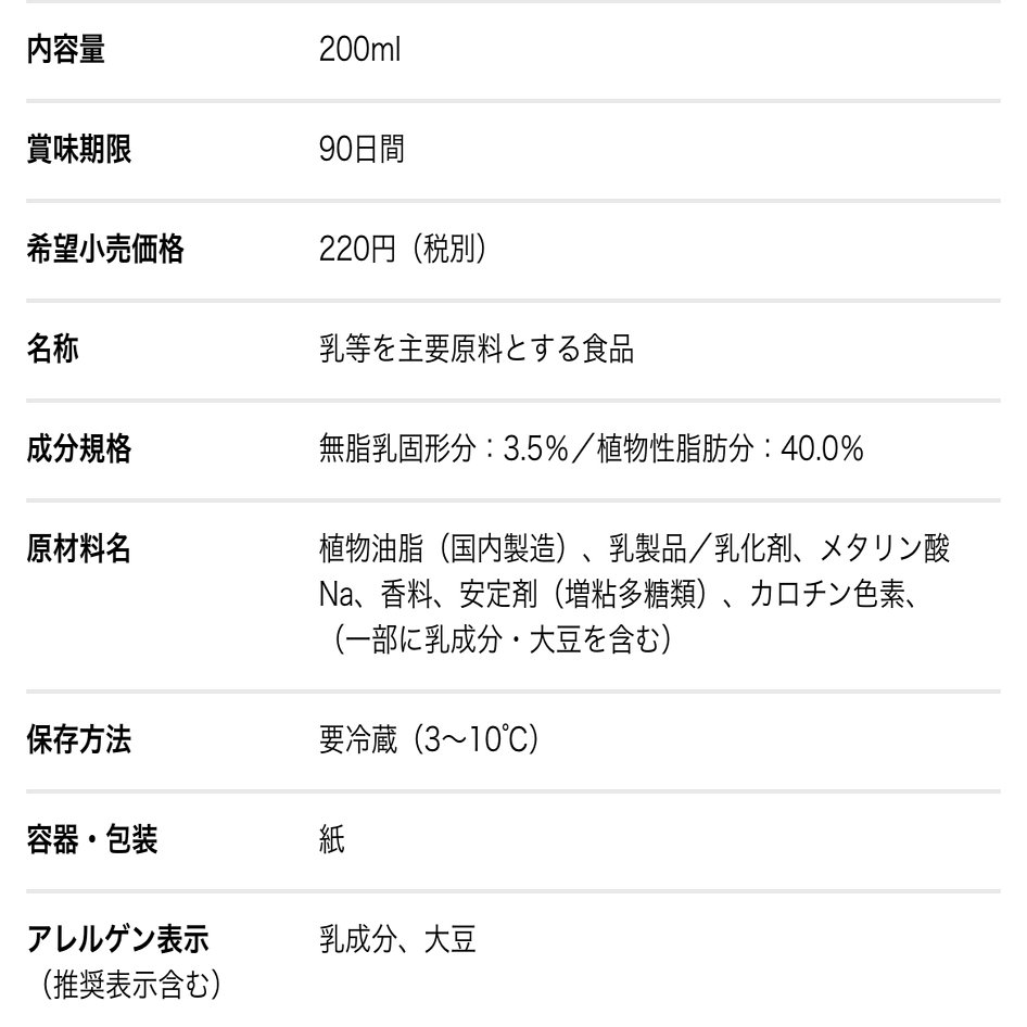 原材料名:植物油脂、乳製品、乳化剤、メタリン酸ナトリウム、香料、安定剤(増粘多糖類)カロチン色素