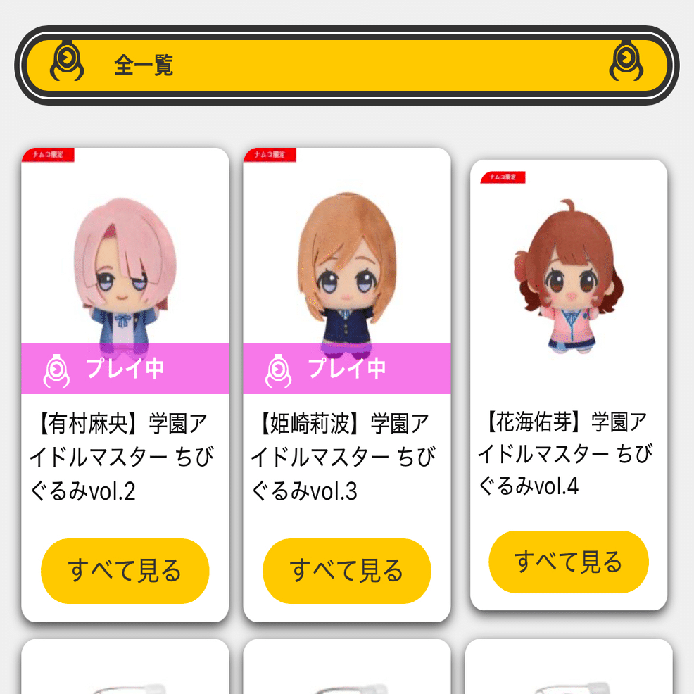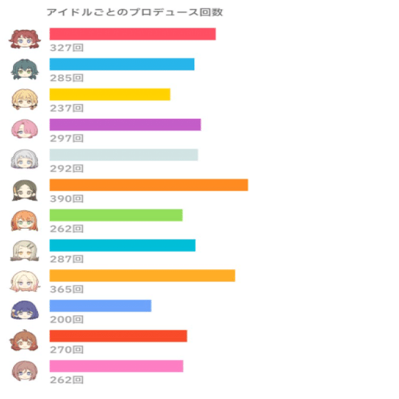 全アイドルに平等に用意され、誰もが平等に入手する機会が与えられたちびぐるみ。アイドルによって値段がつけられているわけでもなく、ライブ会場限定などの入手困難さもない。ちょうどナムクレ側で獲得数を表示してくれてるからこれを使わせてもらう。ストレートにお金を使わせるだけの魅力がアイドルにあることを示しているから非常に分かりやすい。