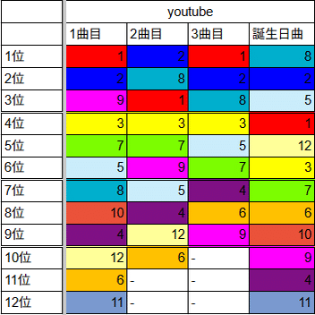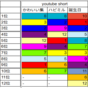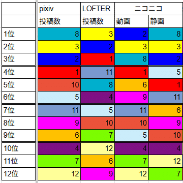 で、いちいち数字全部貼ってたらキリがないから順位だけで語る。画像貼るのはめんどいからメンカラでセル色分けしたけど大体これで分かるっしょ。