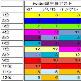 ・公式Twitterにおける誕生日のお祝いポストへのRP、いいね、インプレ数