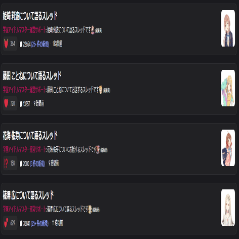 ストーリーを語るスレもほぼキャラ語りスレと変わらないレベル。佑芽星南がぐっと上がったくらいか。千奈はSTEP3があったのに書き込みが片手で収まるレベル。リーリヤのコミュを語る人は皆無と言っていいレベルで50もない。他の数字と比べると謎すぎる。