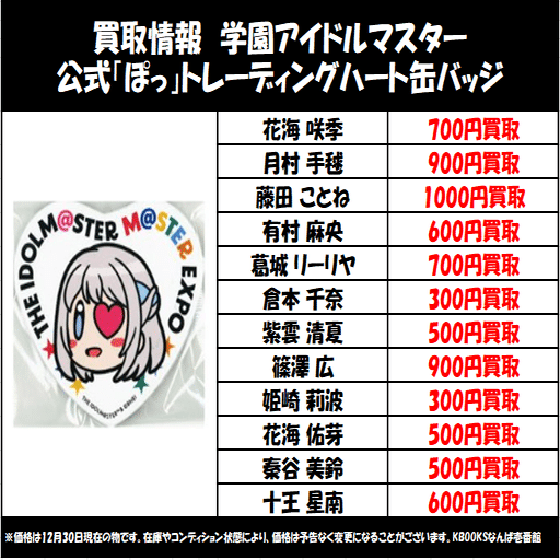 千奈と清夏はほぼすべてのグッズが全キャラ中最低価格の買取で、平均が300円台。特に千奈は500円を超える買取が無かった。