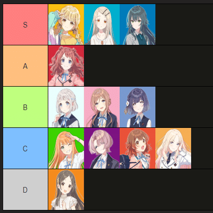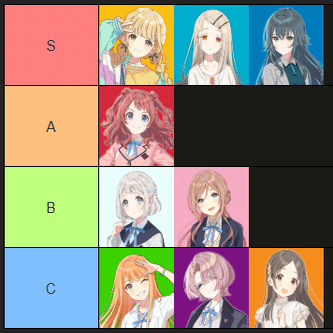 ユニアリだと星南が強いって話を聞いたことある(やったこと無いから知らん)けど、カードが強くても上位3人の牙城は打ち崩せない。生徒会デッキがあるらしいからそれで美鈴も高いのかと思ったけどじゃあ佑芽はなんでやねんっていう。