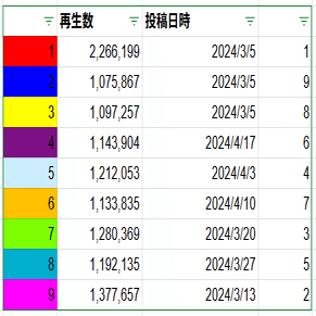 シンプルで分かりやすい。1,2,3曲目と誕生日曲。学マスの楽曲はキャラソンの側面を持つから人気の影響を受けるのは間違いない。投稿順が優位に働くだろって主張をするかもしれないけど、実際の数字を見れば投稿順の不利を跳ね返してる子もいるし、それほど注目を集めた人気があることの証明でもある。キャラ人気は関係なく楽曲だけの評価で再生回数が決まると反論する人は、人気だけど再生回数が少ない曲があるのか教えてほしい。その人気の根拠も含めてね。