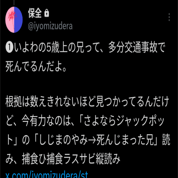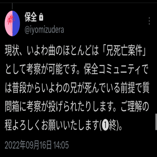 保全は、いよわさんの考察をしていた人物である純セメス(はてなブログ)が運営するアカウントで、いよわさんに関わるコンテンツの保全からボカコレの集団工作まで幅広い活動を行っています。