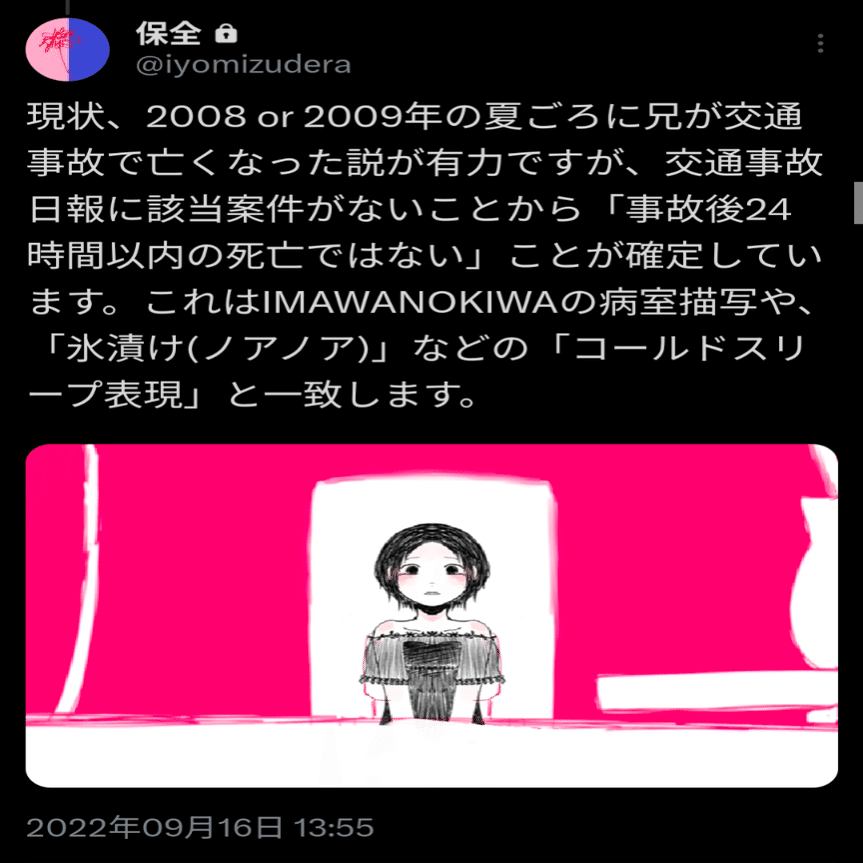 まず「VOCALOIDは歌詞に載っているのとは違う言葉を歌わされている(落涙読み)」を前提としています。いよわさんが設定した歌詞を信じていません。そうして出来上がった考察は、「いよわさんは兄を交通事故で亡くしている」というものでした。