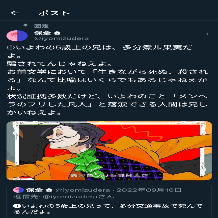 なお、最新の研究ではいよわさんの兄は生きていて、煮ル果実さんで、今まで純セメスが行ってきた考察は型落ちになったそうです。面白いですね。