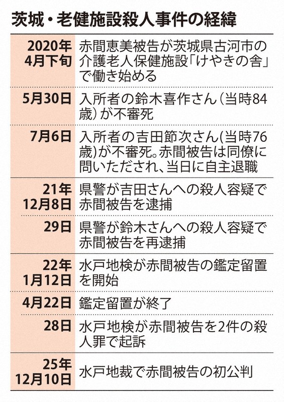 起訴状などによると、赤間被告は古河市の「けやきの舎(いえ)」で20年5月30日、入所していた鈴木喜作さん(当時84歳)の体内にシリンジ(注射器の筒)で空気を注入して殺害し、7月6日にも同様の手口で吉田節次さん(当時76歳)を殺害したとしている。死因はいずれも、血管に空気が入ったことによる急性循環不全だったとされる。