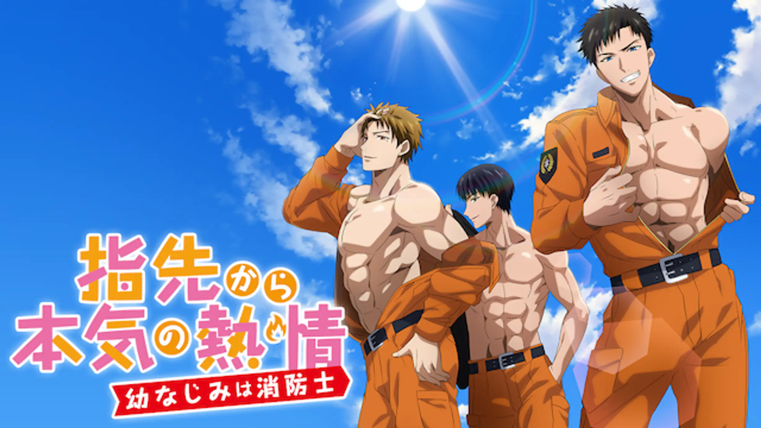 数々の電子コミック配信サイトでランキング1位に輝いた、ティーンズラブコミック『指先から本気の熱情~チャラ男消防士はまっすぐな目で私を抱いた~』(原作:川野タニシ)が待望のアニメ化。2019年7月期にTOKYO MXで5分 間のショートアニメとして放送開始。イケメン消防士の肉体美もさることながら、そのタイプの違うイケメン消防士たちが繰り広げる胸キュンエピソードに目が離せない! 主題歌『BLAZING LUV!!』はキャラクターの水野颯馬や泉友貴、羽瀬淳の3人が美声を響かせる。藤橋涼(高森奈津美)はメーカー勤務のOL。幼なじみの消防士・水野颯馬(伊東健人)に合コンのセッティングを頼まれる毎日を送っていた。「ほら、俺ってチャラいから?」そう言いながら彼女を作らず遊びまくる颯馬をみて、真面目な性格の涼はあきれはてる。そんなある日、涼のマンションが火事に合ってしまい、逃げ遅れてしまった涼。そこに駆け付け、助けてくれたのはほかならぬ颯馬だった。火事によって住む場所を奪われた涼に対し、颯馬はアテがないならの自分の部屋に泊まらないかと提案する。その提案を受け入れた涼だったが、はじめは颯馬を警戒する。やがて、涼は颯馬を意識し始め…ひょんなことからふたりの距離が縮まっていく…。真面目なOL・涼とイケメン消防士・颯馬とのアツい関係はどうなっていくのか!? 【
