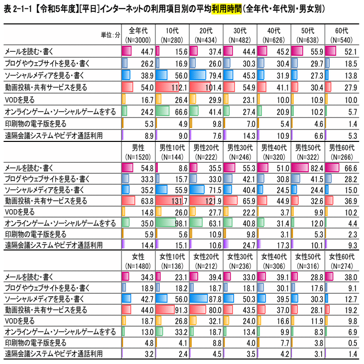 総務省の調査によれば、10代で動画共有サービスの利用時間は、平日112.1分/休日174.0分。次点で音リンゲームの平日66.5分/休日91.2分で、圧倒的に10代、20代は動画が多い。