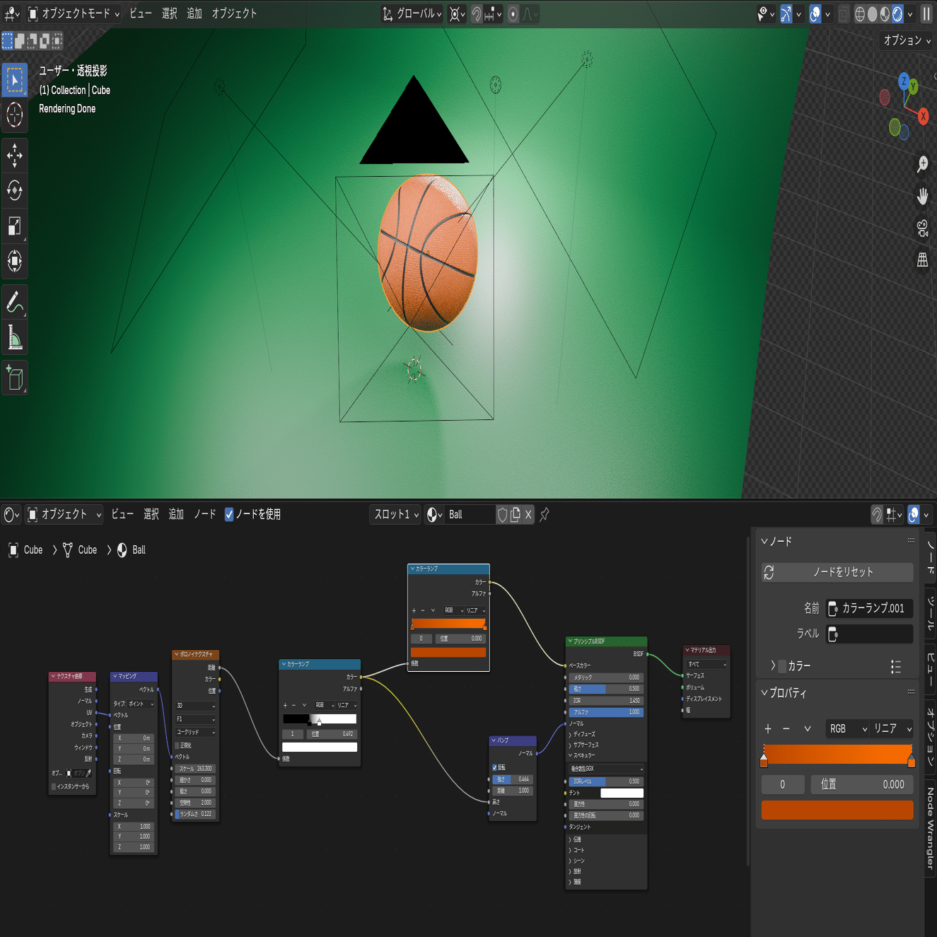 シェーダーノードとの突然の出会い。箱を線でつないで、展開図みたいのが出てきた時は「もうツルッツルのボールで良くない?」ってなりながら笑、バスケットボール表面の質感を出すために、何度も動画を戻して言われるがままに設定しました。