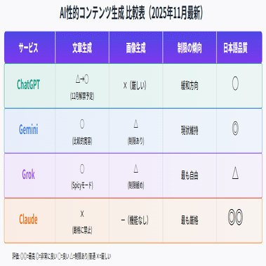 2025年11月現在、性的コンテンツ生成に関する各AIの状況は以下の通りです: