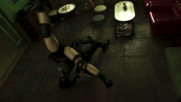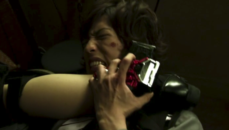 倒れ込む翔太郎を、胸のジッパーを下ろしながら冷ややかに見つめるレイカ。