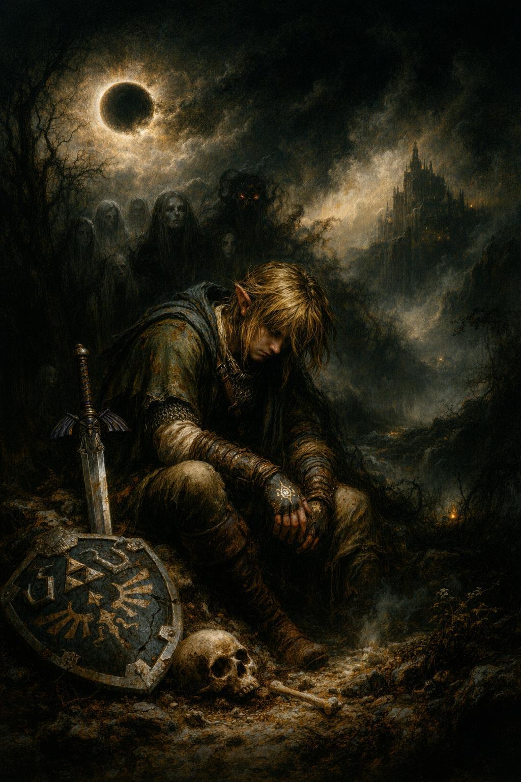 {The Legend of Zelda} illustrated in the Dark Romanticism style of Francisco Goya (specifically the 1797–1798 "Osuna Witch" paintings): {