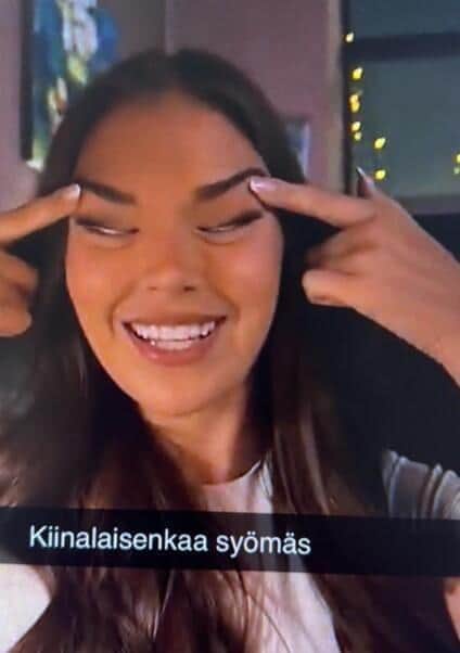 Miss Suomi venyttää silmänsä vinoon. Ystävä jakaa tästä kuvan someen saatteella: ''Kiinalaisenkaa syömäs.''
