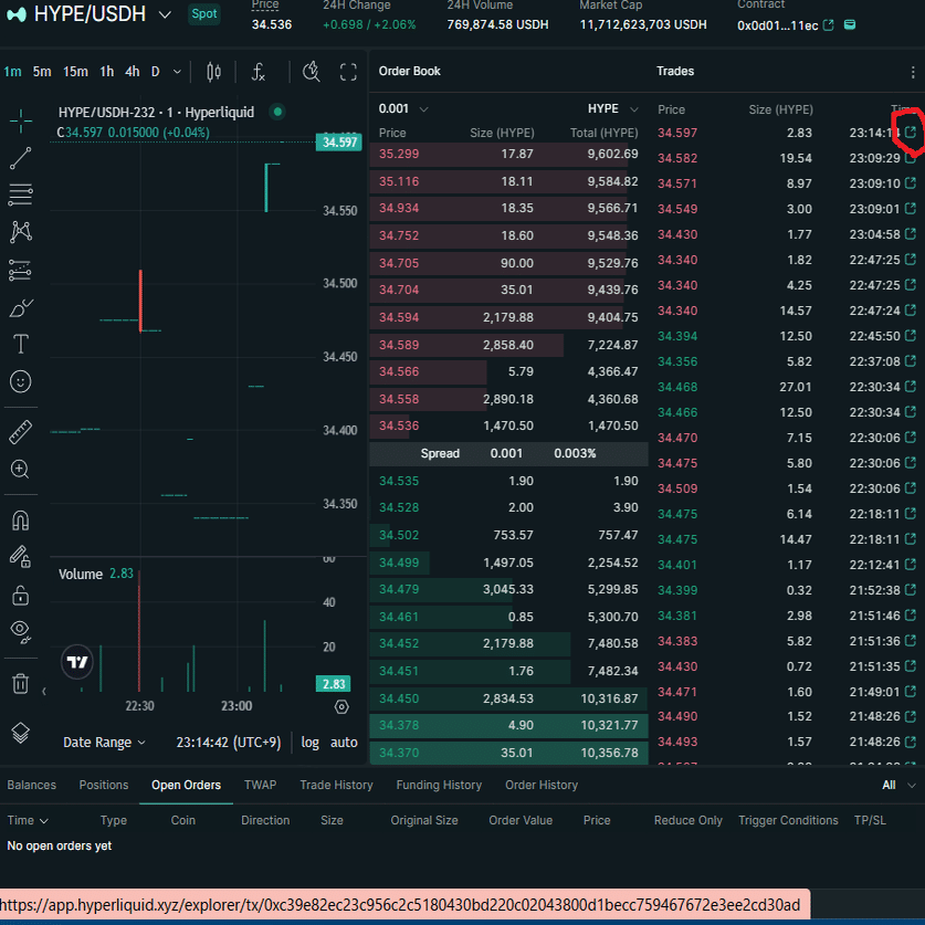 異常な取引があったときなど、取引履歴からたどることで、誰が取引を行ったのか(User)知ることができます。取引の詳細についてはユーザーアドレスからさらに深堀りすることができますが、それについては後述のHypurrcanなどを使うと良いと思います。